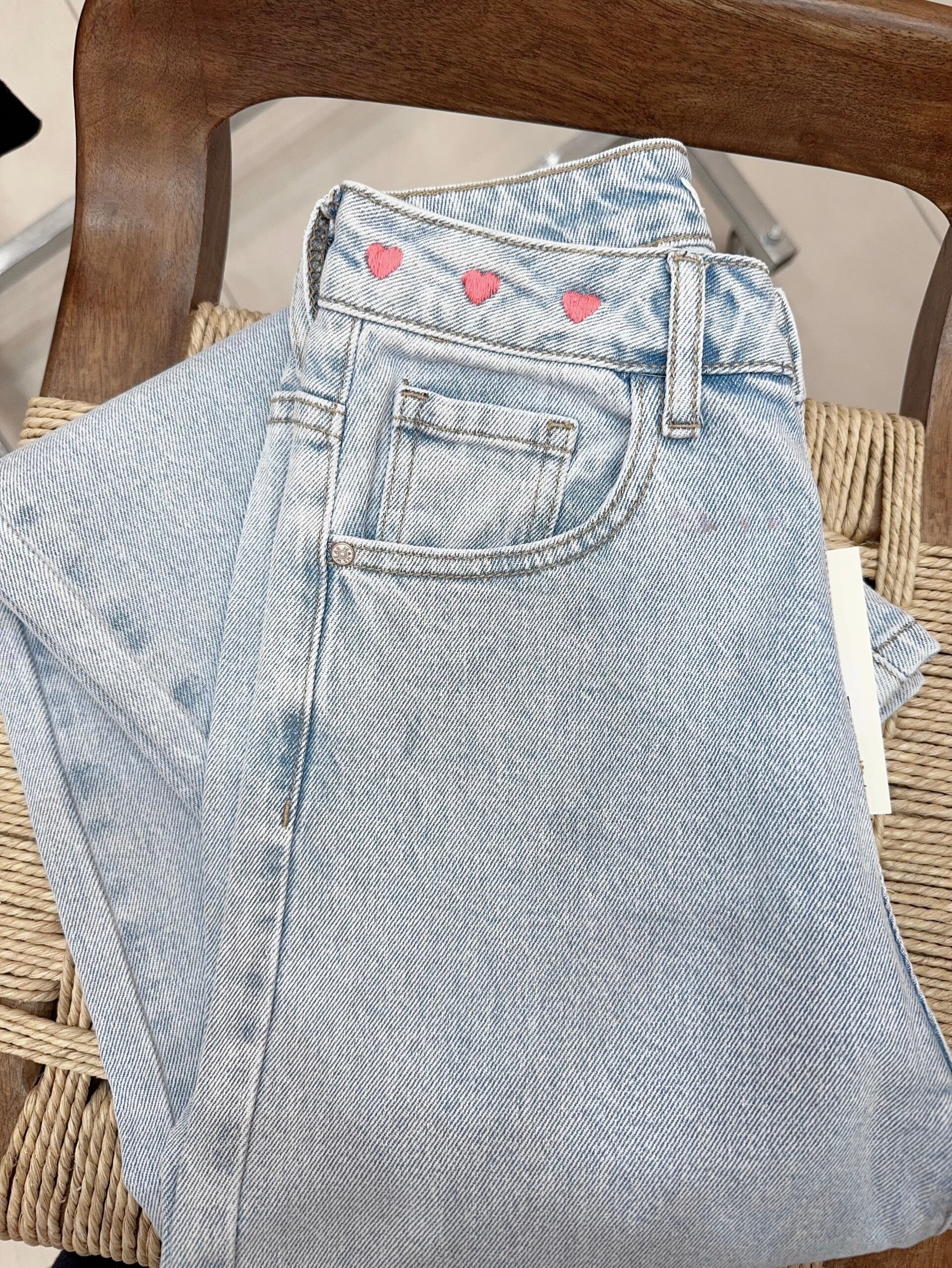 ♡ Jeansbroek met wijdere pijpen en leuk geborduurde hartjes boven de zak