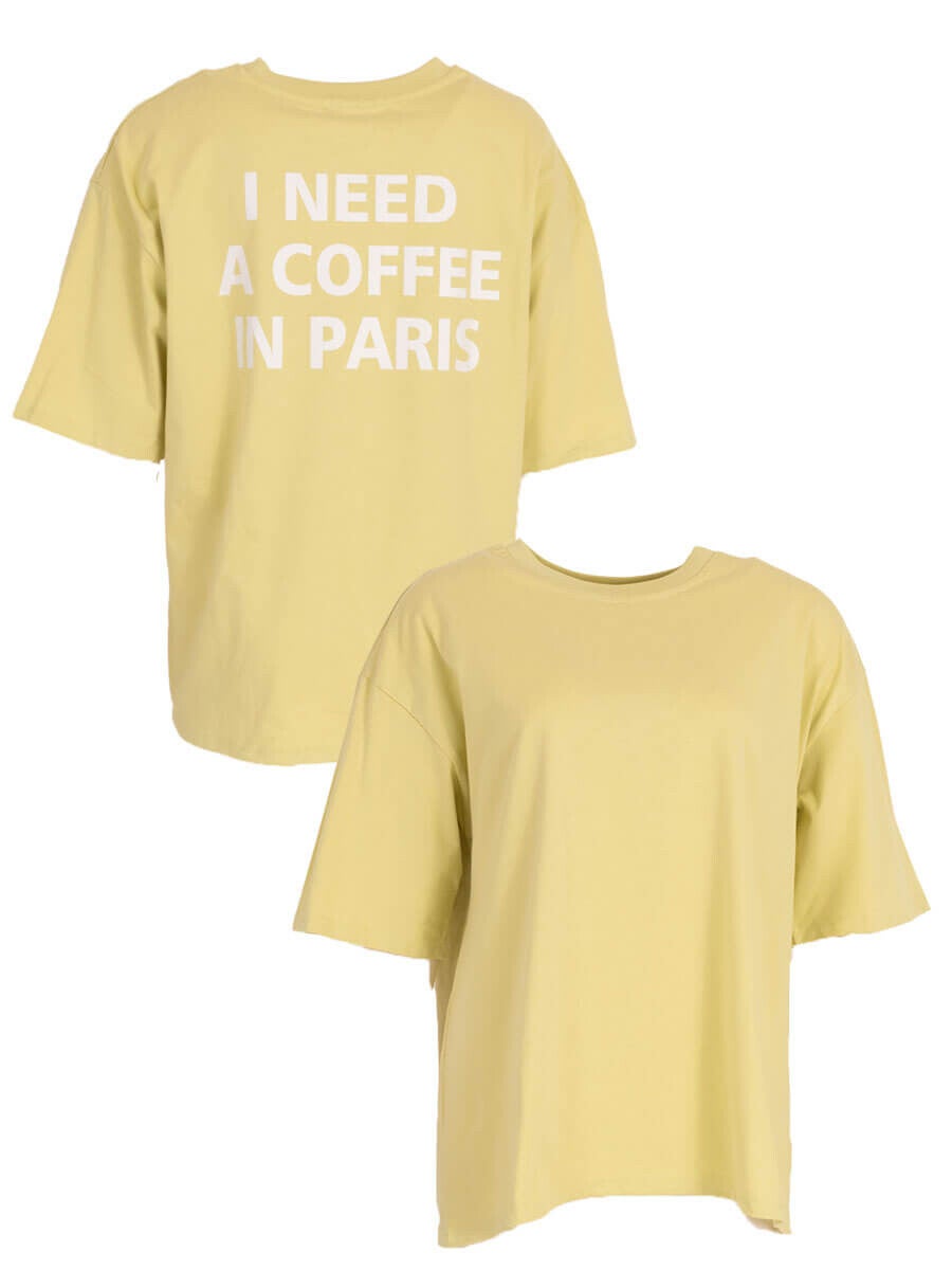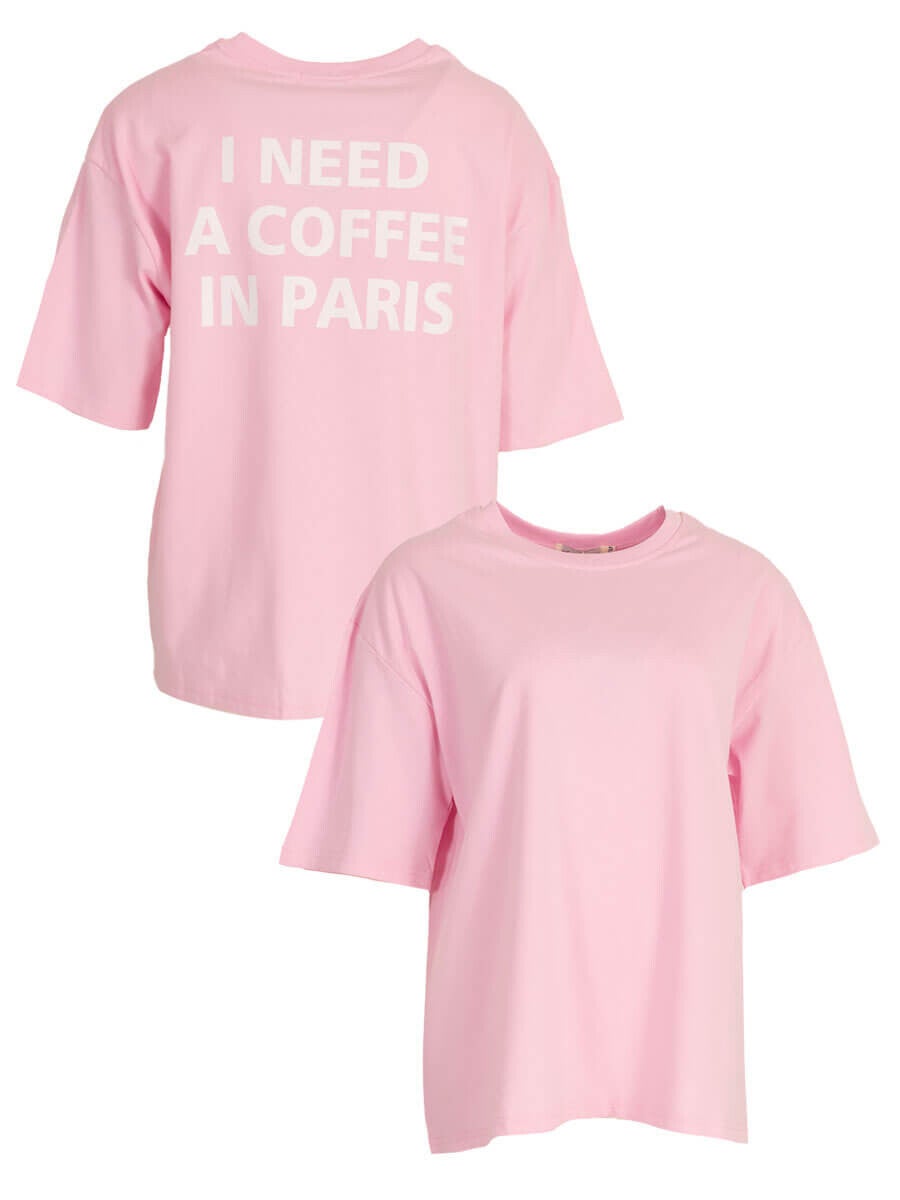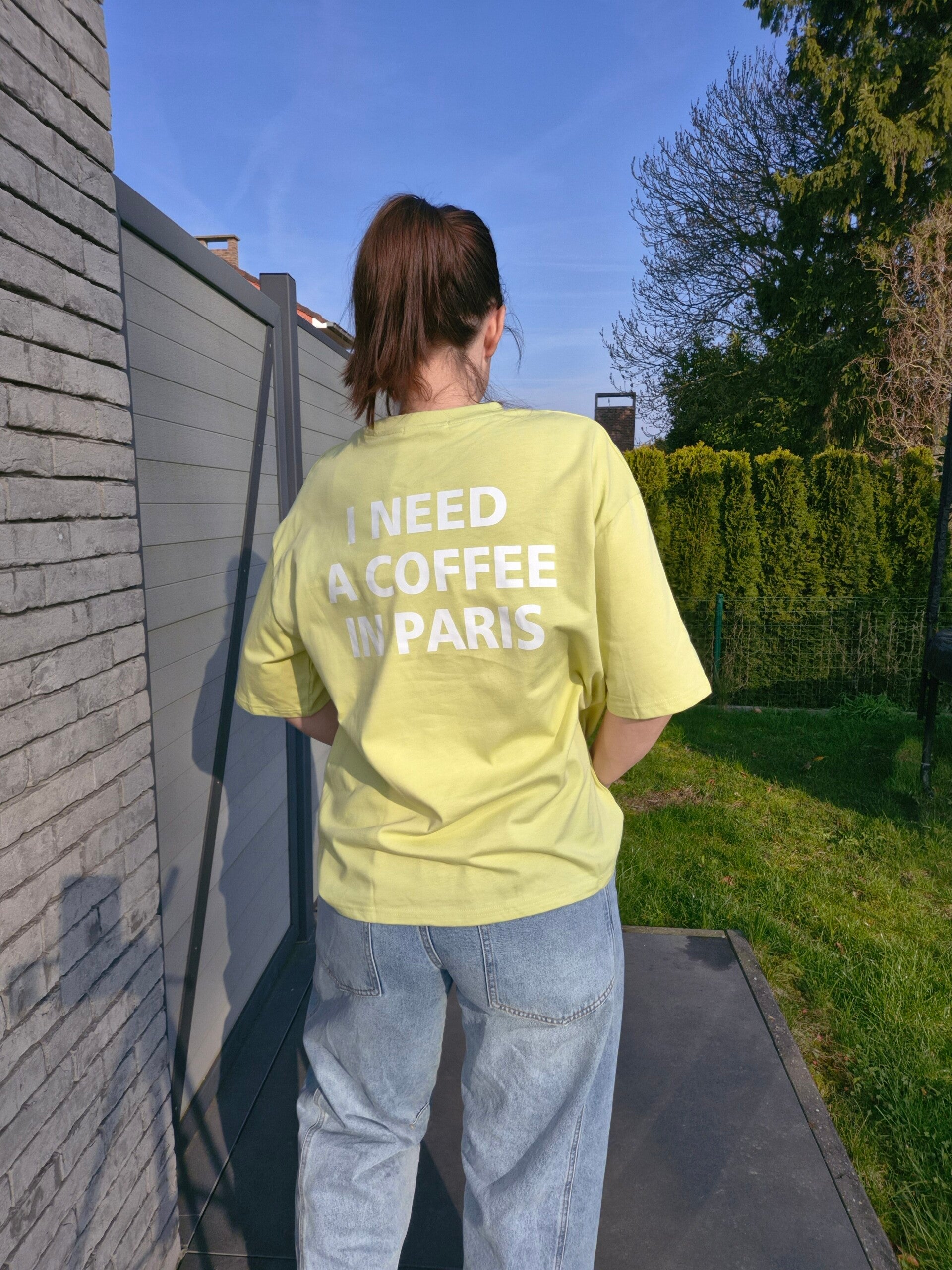 ♡ Kleurrijk T-shirt met opschrift 'I need a coffee in Paris' op de rug.