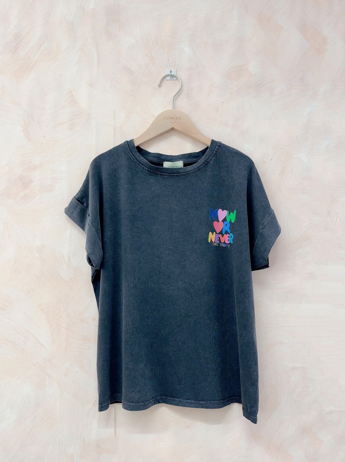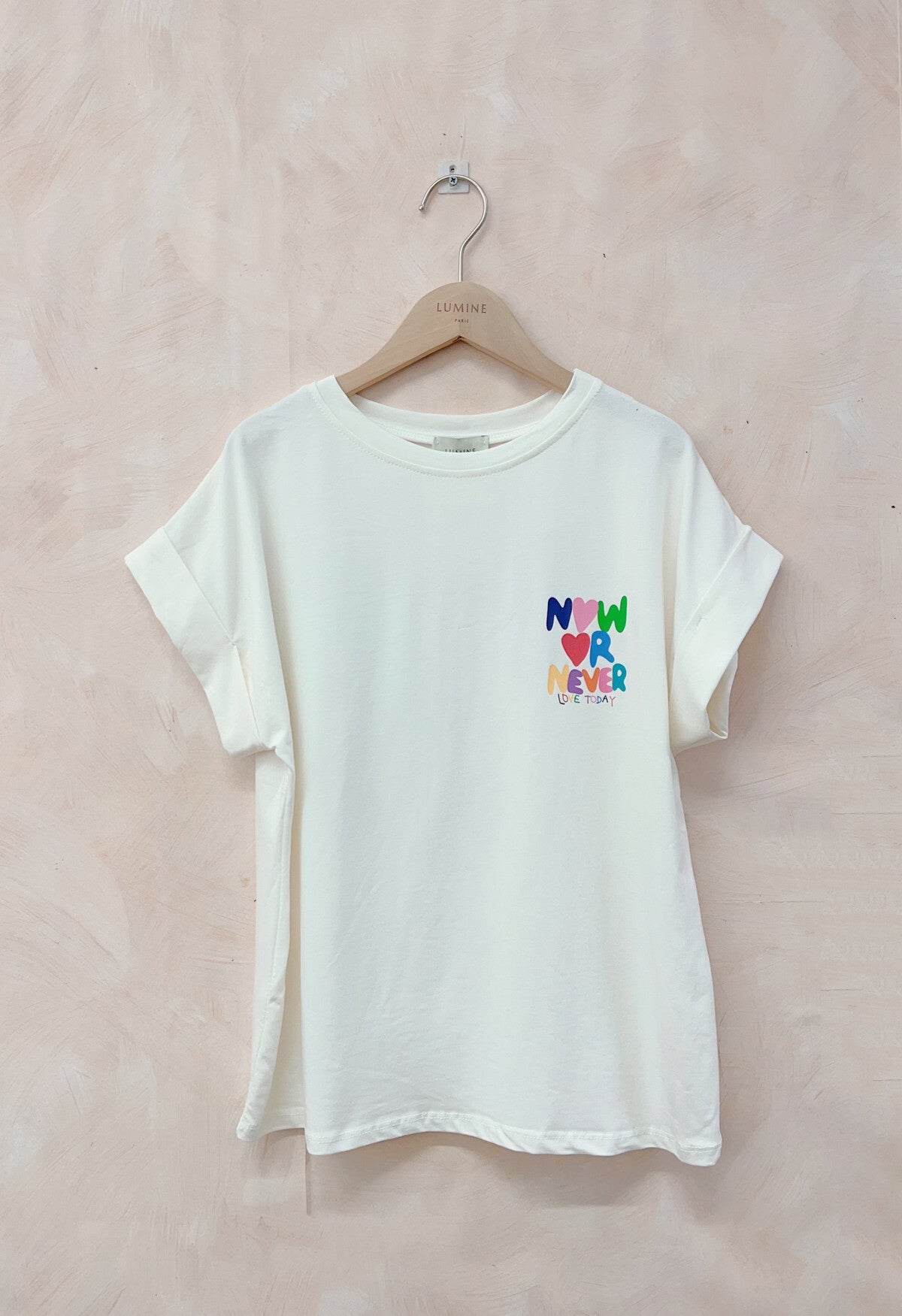 ♡ Witte, losse T-shirt met opschrift 'Now or Never' op de borst en rug.